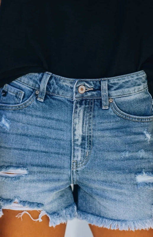 Women's Mid Waist Buttoned Denim Shorts With Frayed Hem