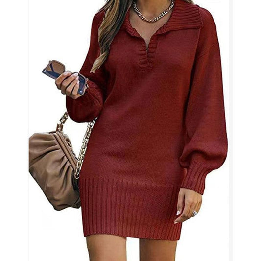 Women's Lantern Sleeve Short Length V-Neck Knit Jumper Dress