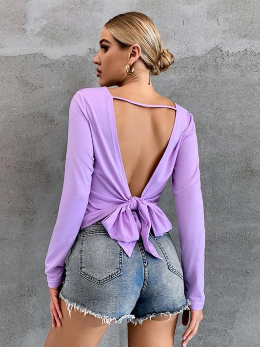 Women's Open Back Bottom Tie Long Sleeve Top