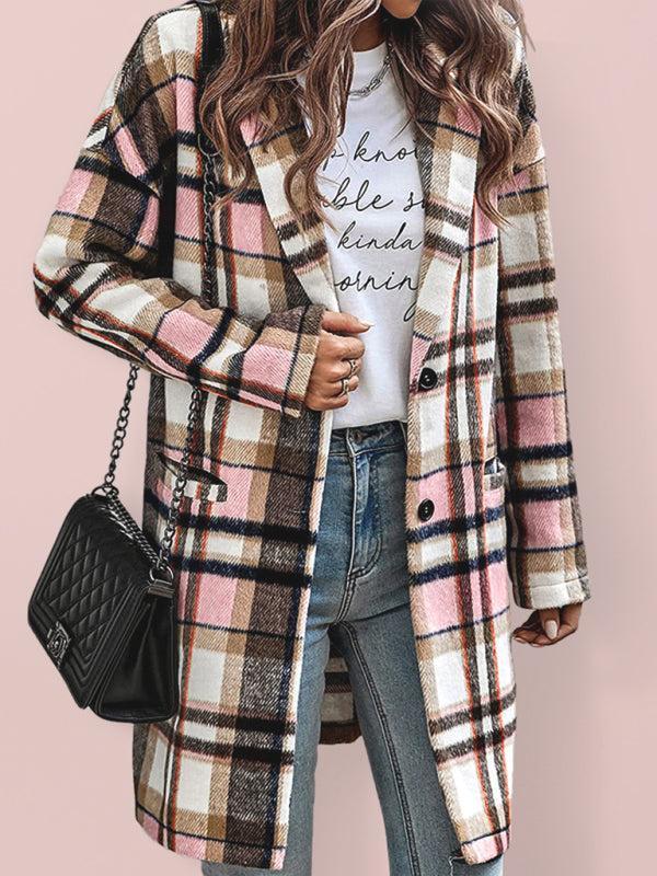 Women’s Button Front Plaid Print Long Blazer Coat